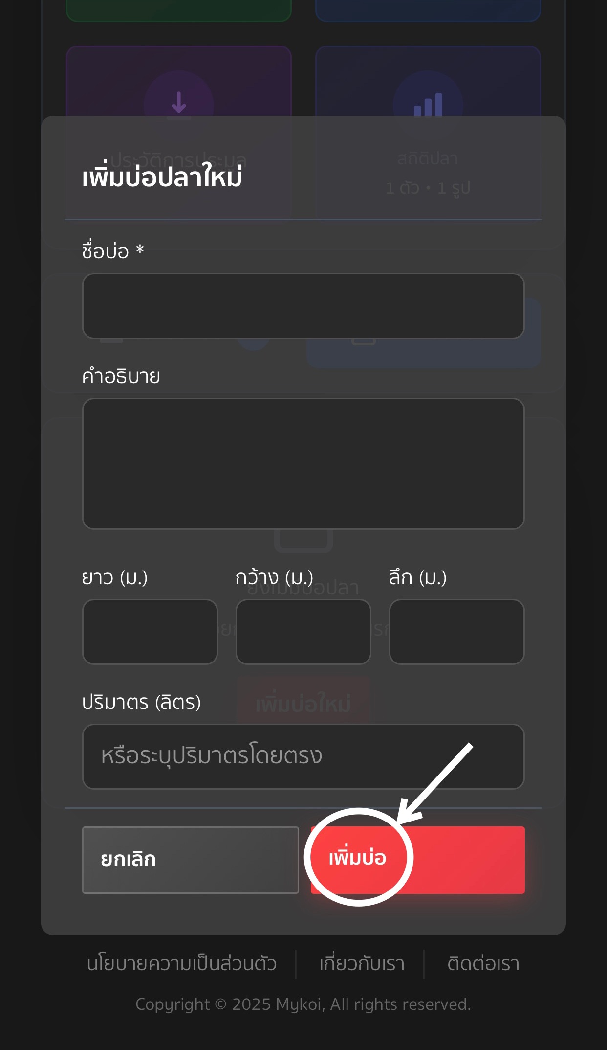 2. กรอกข้อมูลต่าง ๆ ชื่อบ่อ คำอธิบาย ใส่ความยาว ความกว้าง และความลึก รวมถึงปริมาตรน้ำ (ลิตร) หากไม่ทราบปริมาตรน้ำ ไม่ต้องใส่ก็ได้ เดี๋ยวระบบจะคำนวณให้อัตโนมัติ จากนั้นกดเพิ่มบ่อ
