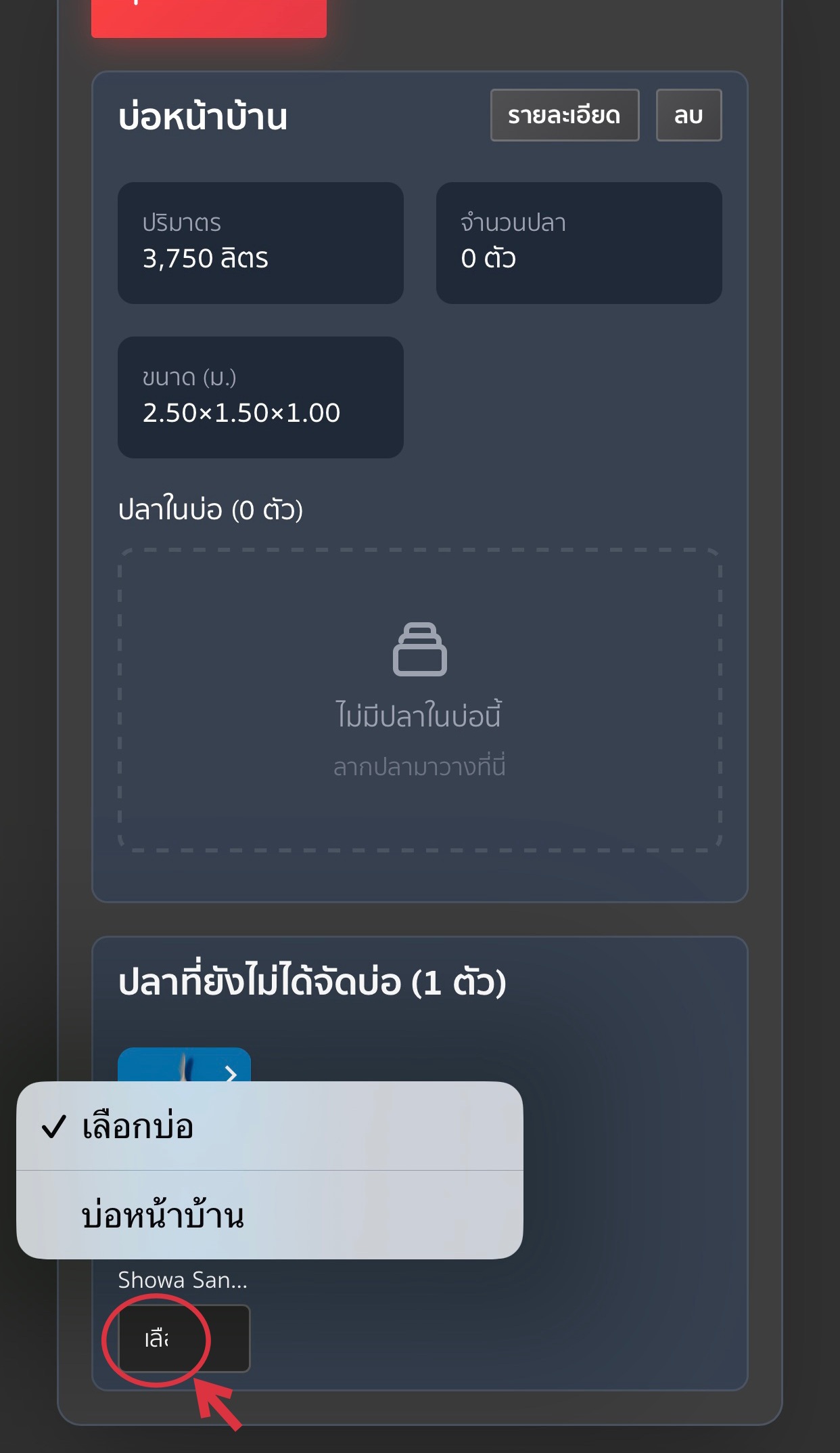 3. เว็บไซต์จะพาไปยังหน้าแดชบอร์ด ให้เลื่อนลงมาด้านล่าง กดจัดการบ่อปลา จะพบกับข้อมูลบ่อที่เราเพิ่มไว้ก่อนหน้านี้ และปลาที่ยังไม่ได้จัดบ่อ ให้เราเพิ่มปลาในบ่อโดยการกดเลือก แล้วเลือกบ่อที่ต้องการ ระบบจะเพิ่มปลาในบ่อ