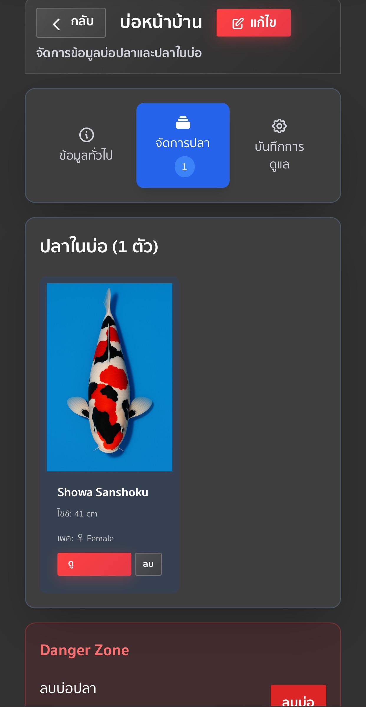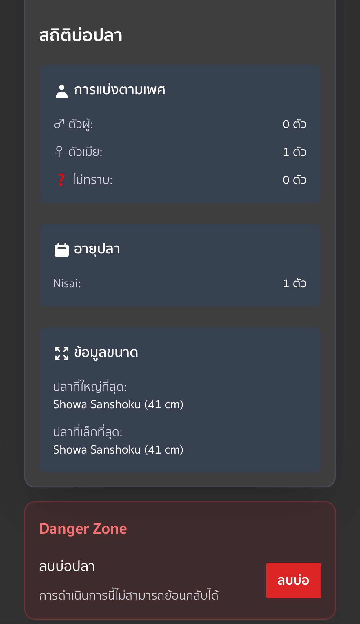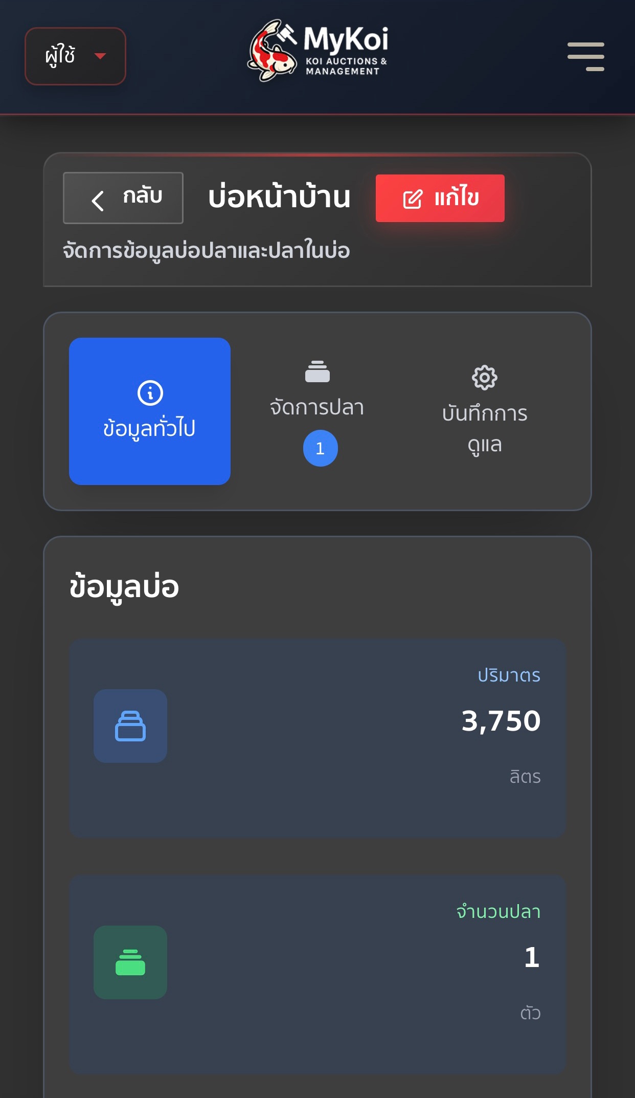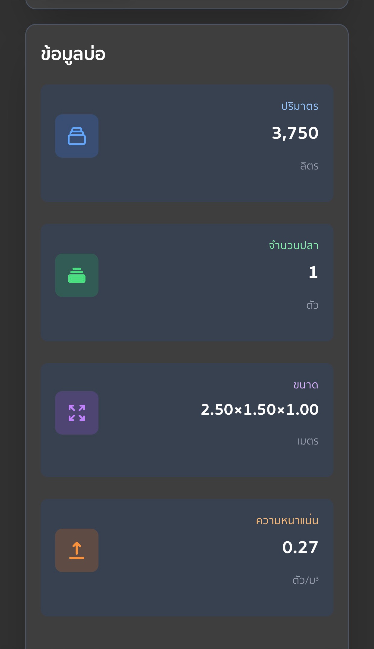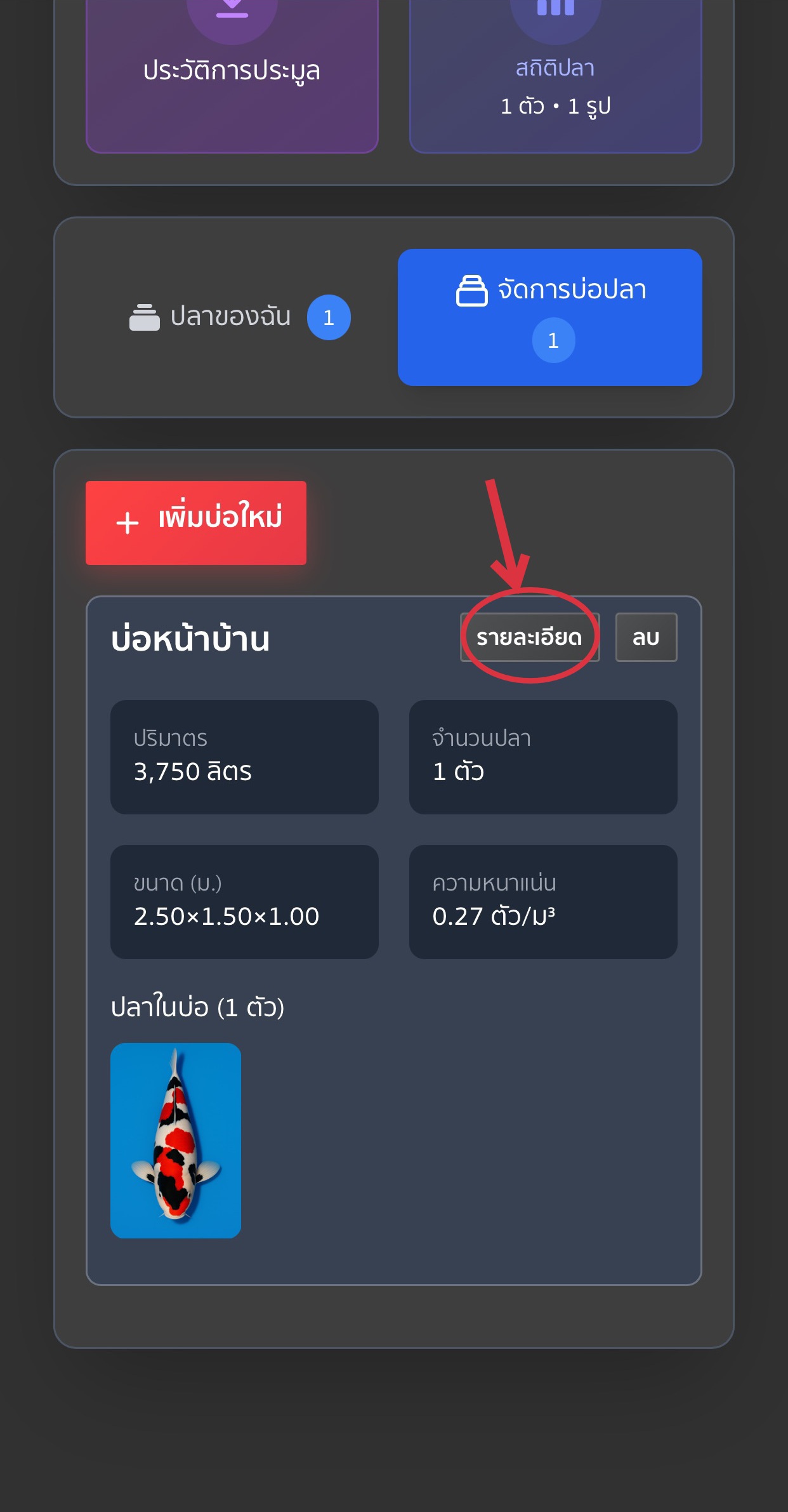 4. เราสามารถเช็คบ่อ เพื่อจัดการข้อมูลบ่อปลาและปลาในบ่อ โดยการกดรายละเอียด จะขึ้นข้อมูลทั่วไป อาทิ ข้อมูลบ่อ, ปริมาตรของบ่อ (ระบบคำนวณให้), จำนวนปลา, ขนาดบ่อ และความหนาแน่นของปลาต่อบ่อ รวมถึงสถิติบ่อปลา การแบ่งตามเพศ อายุปลา และข้อมูลขนาดปลาที่เราบันทึกไว้