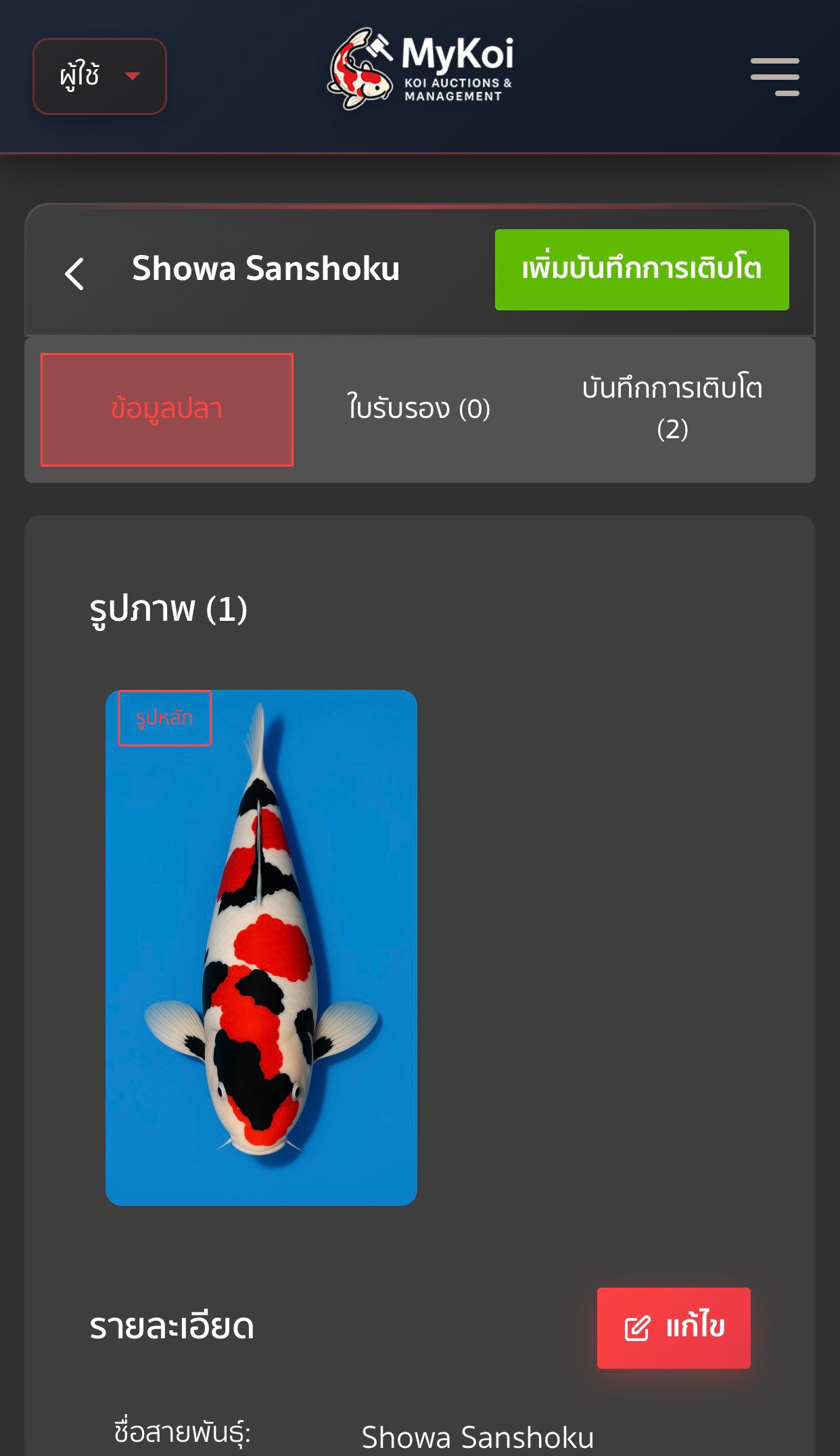 5. เมนูจัดการปลา หน้าเว็บไซต์จะขึ้นปลาในบ่อที่เราเลือกไว้ เราสามารถกดดูรายละเอียดของปลาได้ หน้าเว็บจะพาไปยังหน้าการจัดการปลาที่มีข้อมูลปลา ใบรับรอง และบันทึกการเติบโต