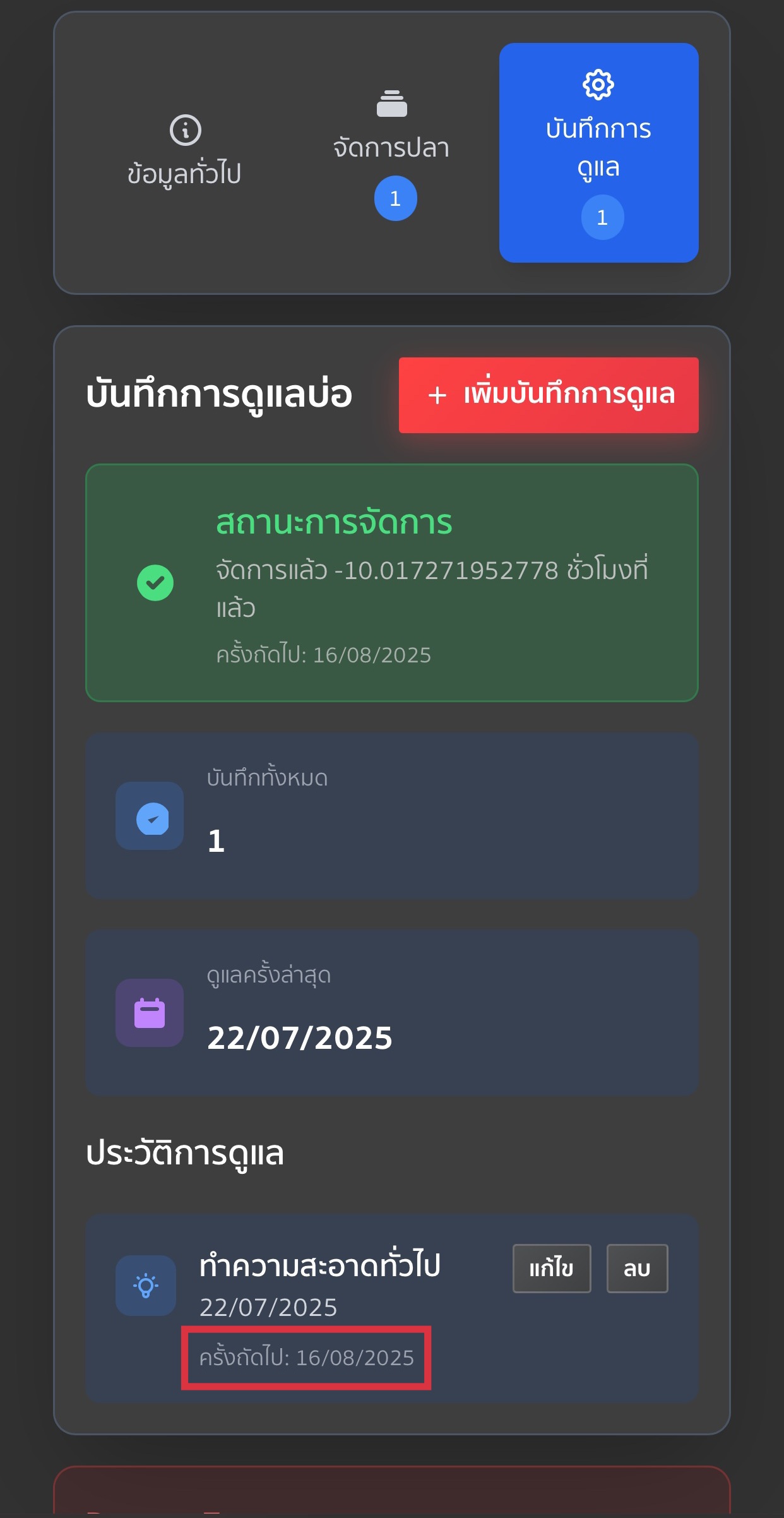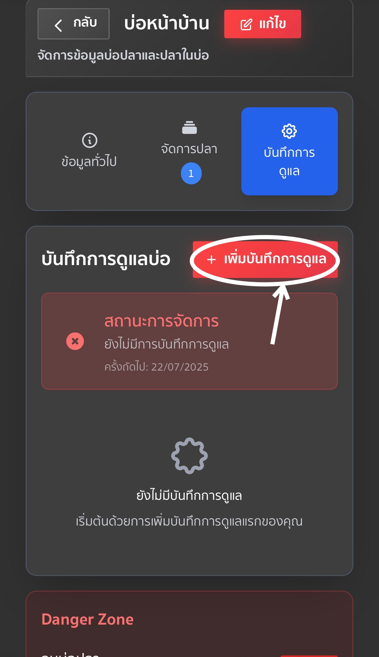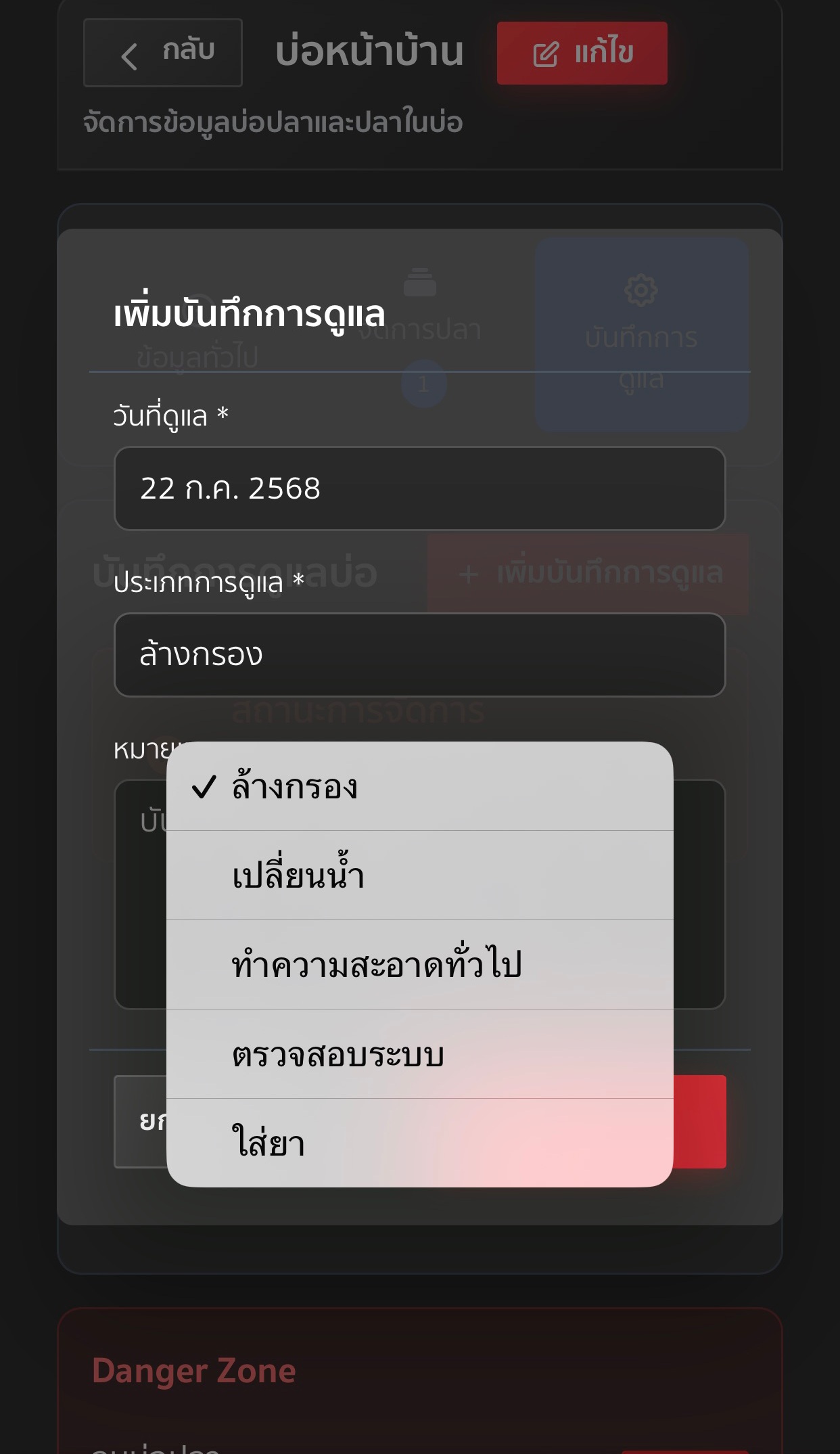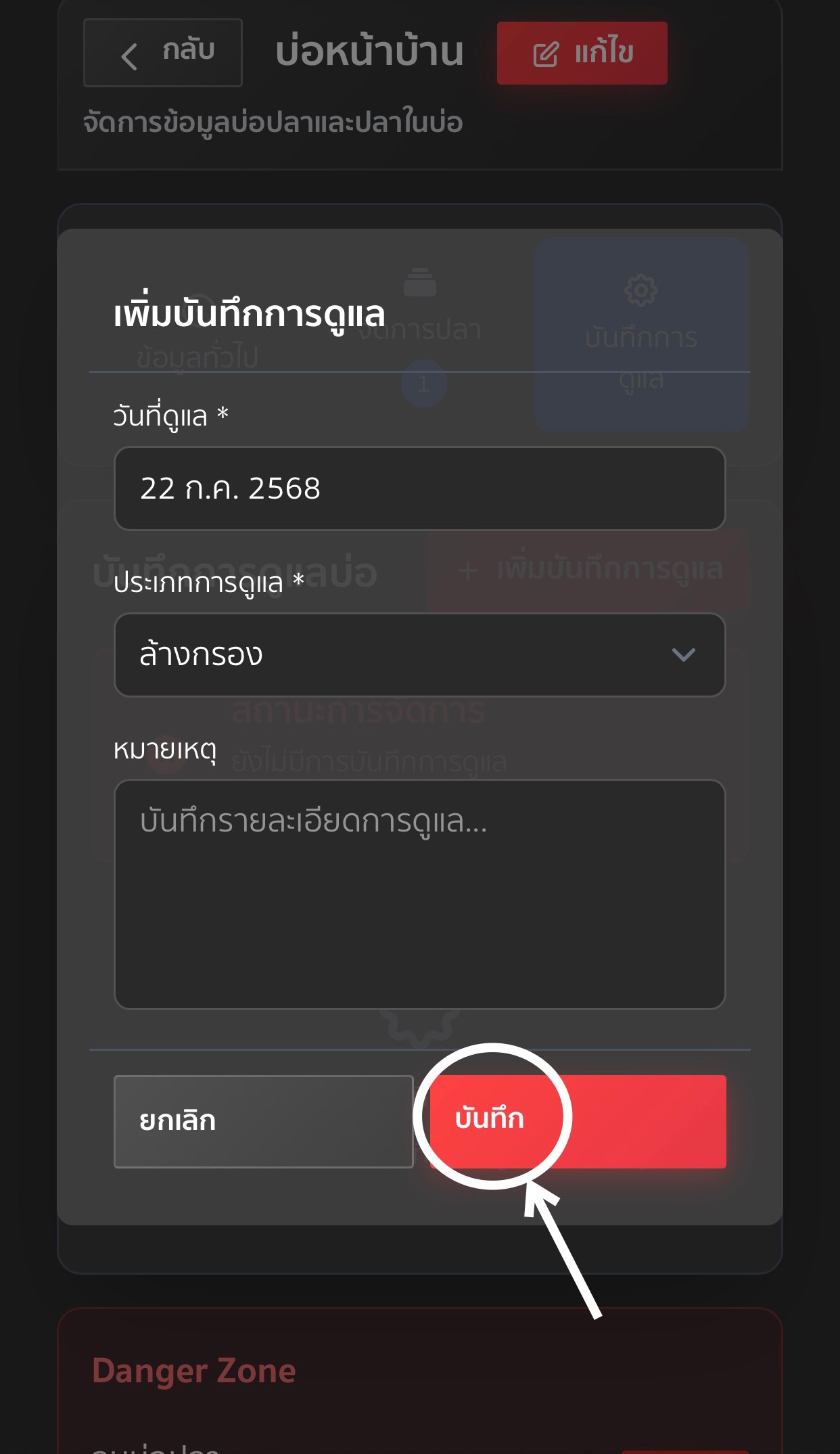 6. ส่วนเมนูบันทึกการดูแล เป็นบันทึกการดูแลบ่อของเรา กดเพิ่มบันทึกการดูแลบ่อ จะขึ้นเพิ่มบันทึกการดูแล สามารถกรอกวันที่ดูแล ประเภทการดูแล อาทิ ล้างกรอง เปลี่ยนน้ำ ทำความสะอาดทั่วไป กดเลือกได้เลย และหากต้องการพิมพ์หมายเหตุ ก็พิมพ์ใส่เพื่อบันทึกได้เลย เราสามารถเช็คประวัติบันทึกการดูแลบ่อได้จากเมนูนี้ รวมถึงระบบจะแจ้งวันที่ต้องดูแลครั้งถัดไปอีกด้วย หรือก็คือ ทุก ๆ 15 วัน นั่นเอง