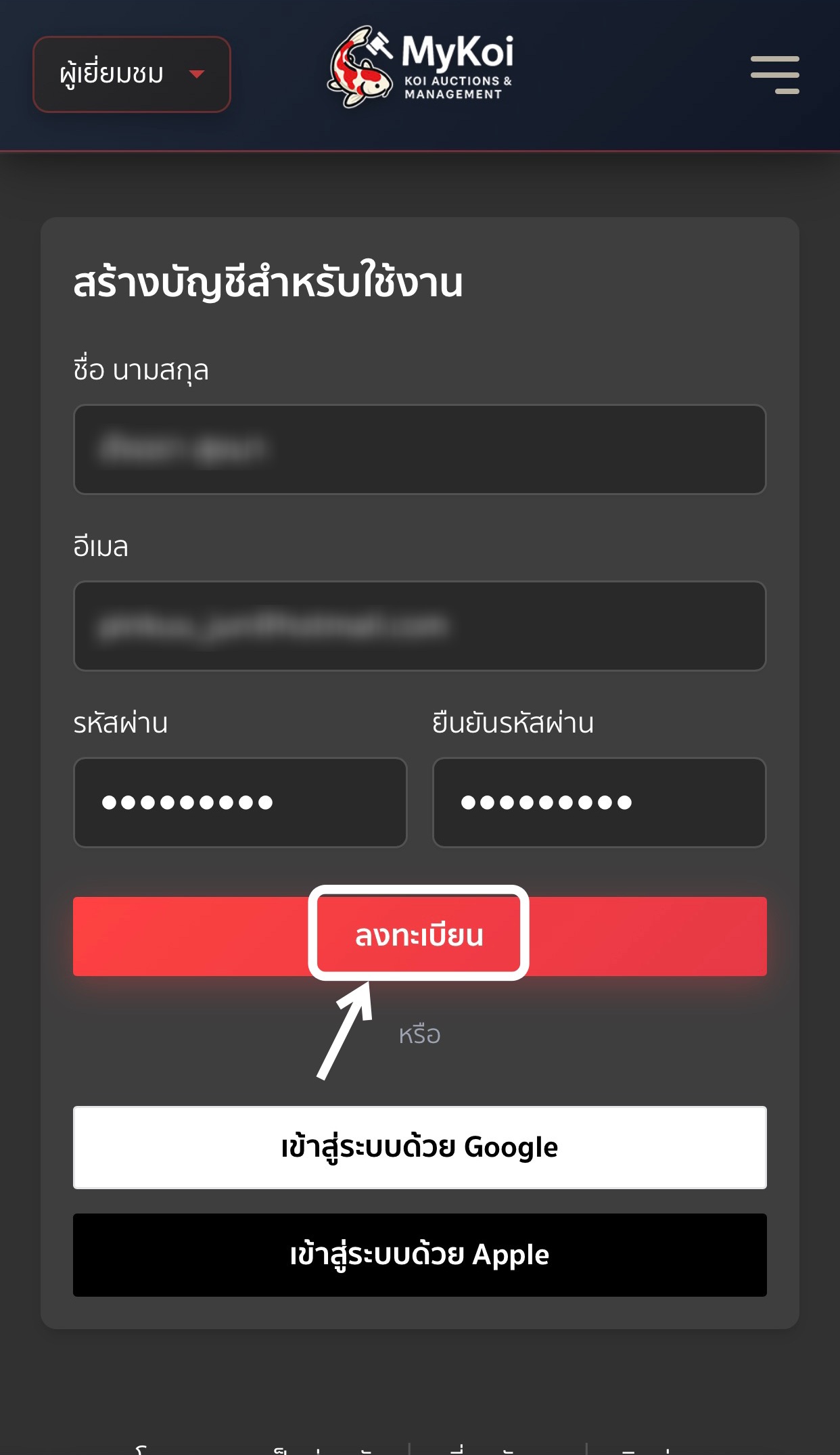 3. กรอกรายละเอียดให้ครบถ้วน พิมพ์ ชื่อ นามสกุล อีเมล รหัสผ่าน และยืนยันรหัสผ่านอีกครั้ง จากนั้นให้กดลงทะเบียน