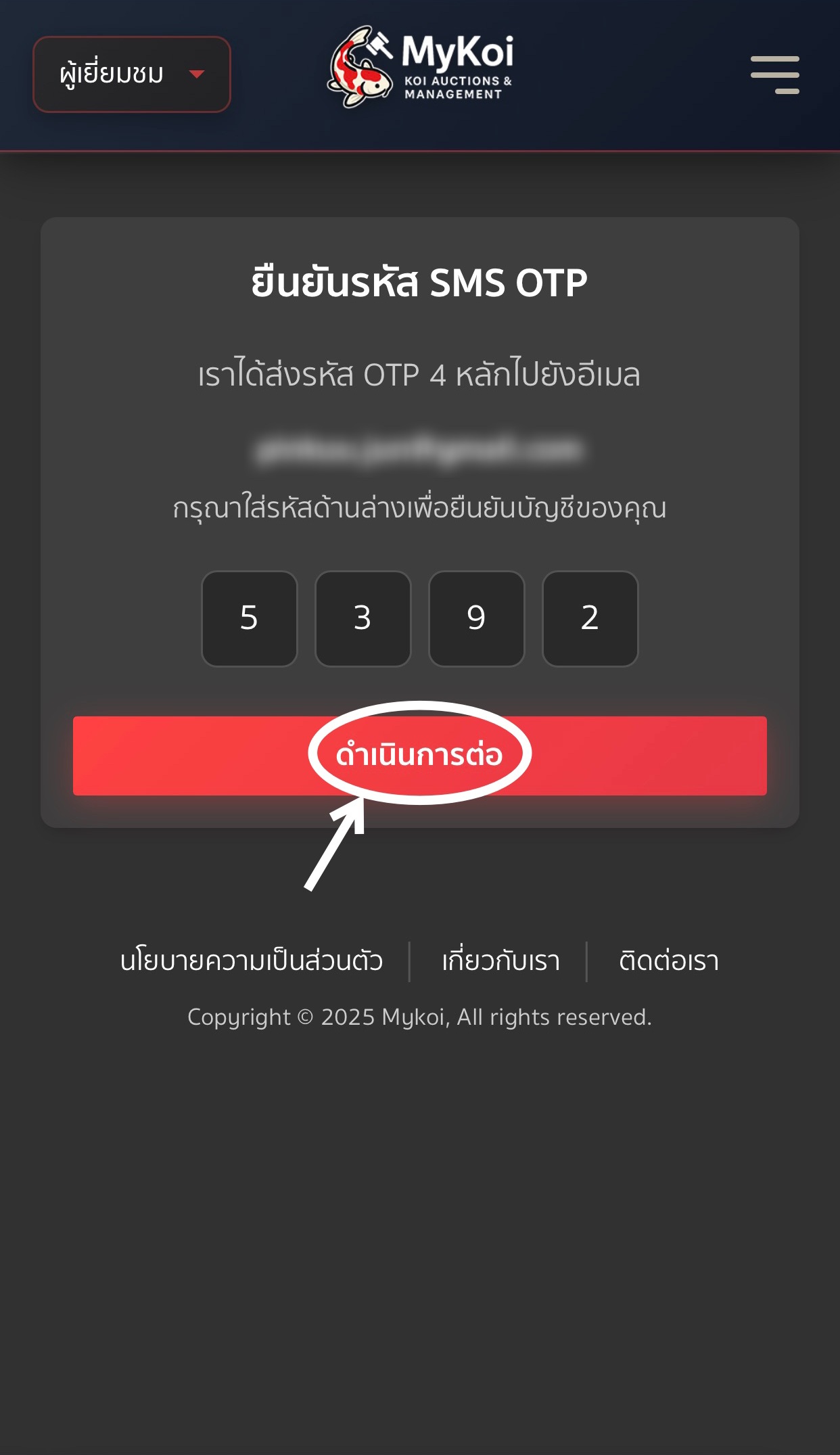 4. เว็บไซต์จะพาไปยังหน้ายืนยันรหัส SMS OTP จะมีรหัส OTP ส่งไปยังอีเมลที่คุณสมัครไว้ ให้เช็คในอีเมลขยะ หรือ Junk Email จะพบรหัส OTP 4 หลัก นำรหัสมากรอกใส่ แล้วกดดำเนินการต่อ เพื่อยืนยันบัญชีของคุณ
